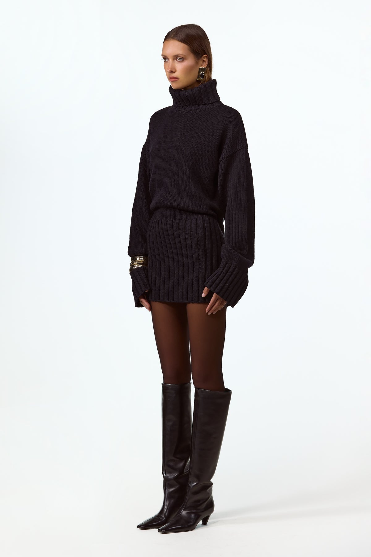A sculptural knit mini dress crafted in the our signature chunky knit. Designed with an oversized turtleneck and voluminous sleeves balanced by exaggerated cuffs. The fitted skirt hugs the hips, creating a dropped effect against the relaxed top. A modern proportion play in a single piece.