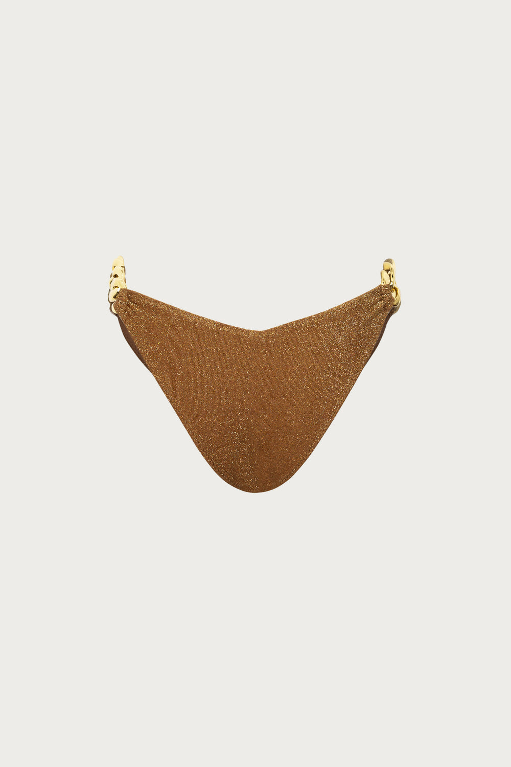 A staple bikini bottom with a v-cut front and embellished with oversized chains on the sides designed so that it can be pulled high on the hip, elongating your legs.