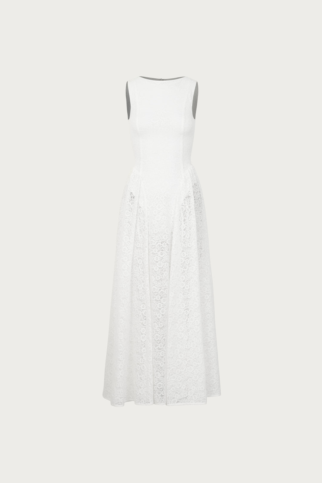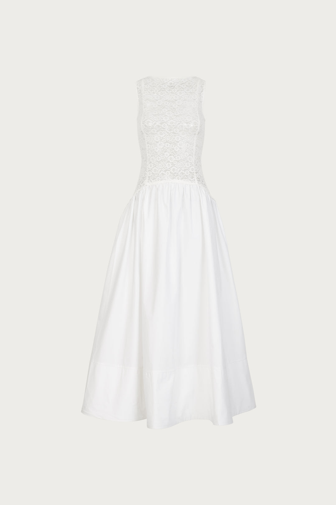 This maxi skirt features a structured double-layer satin waistband with pearl button accents at the back. The crisp cotton poplin body is tailored with princess seams and finished with functional pockets. A double-layered panel at the hem adds weight and movement, creating a beautifully balanced piece.