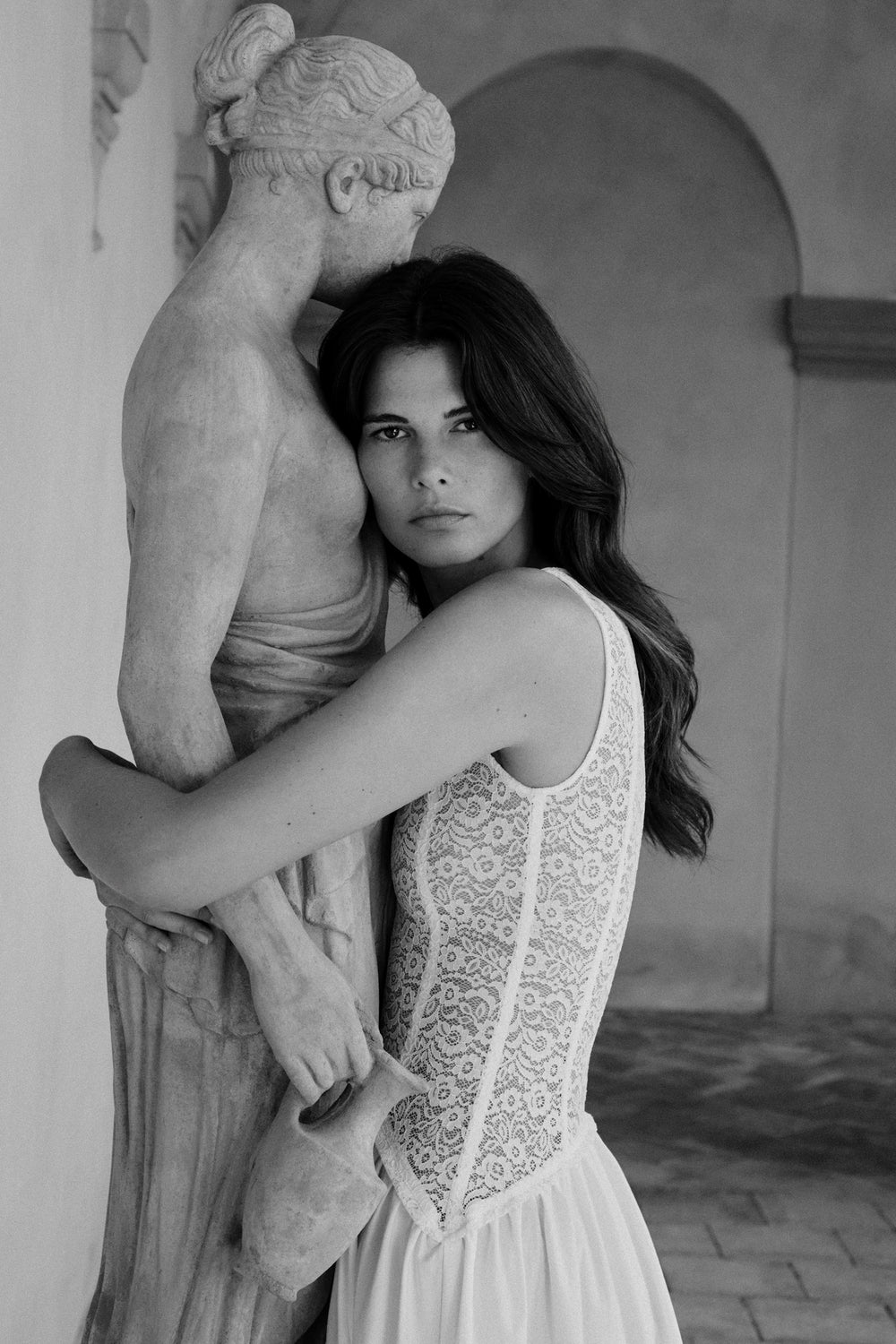 In studio model measurements: Height 5'8, Bust 32B, Waist 24", Hip 34"