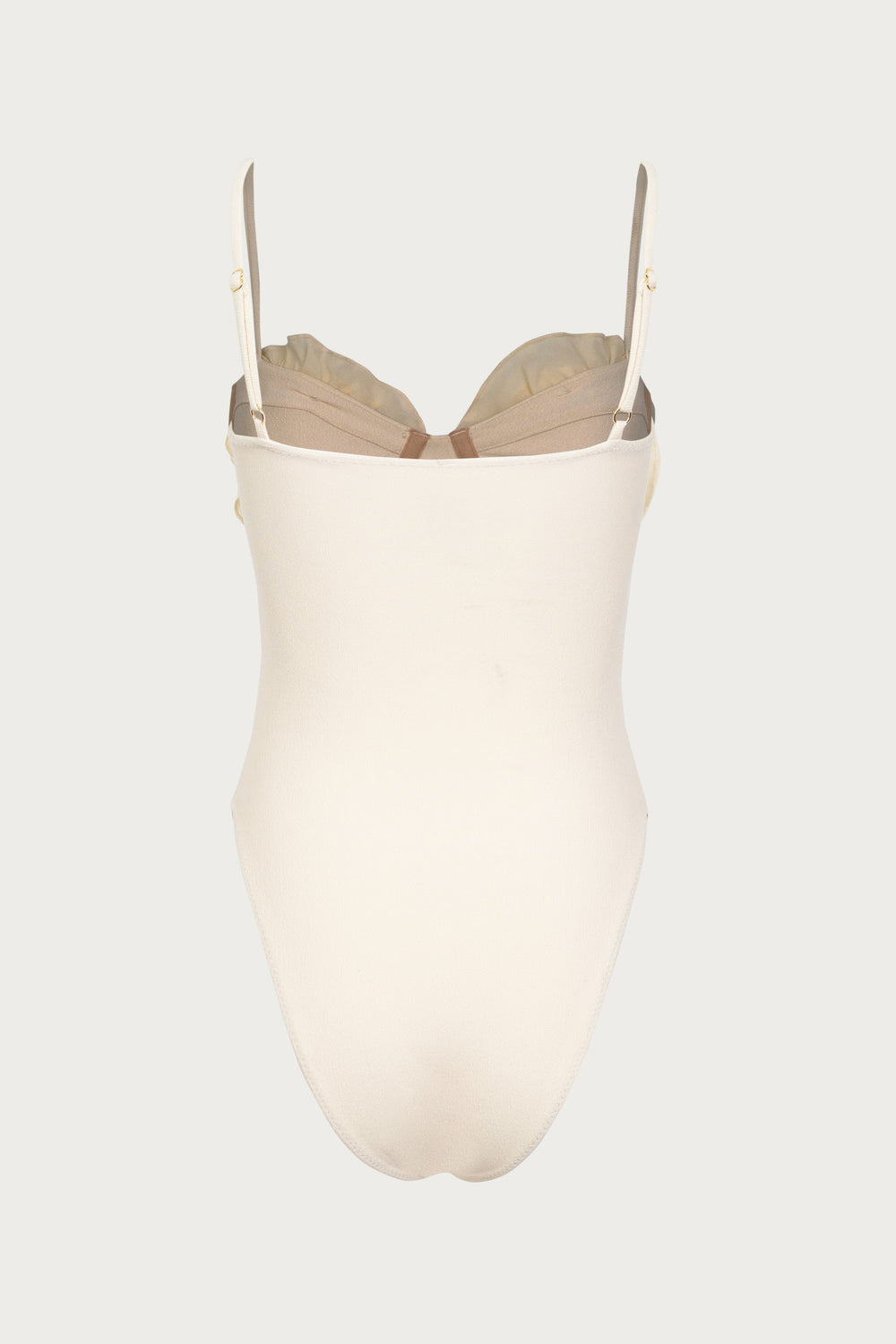 This bustier one piece features two oversized hand made three-dimensional rose bloom.