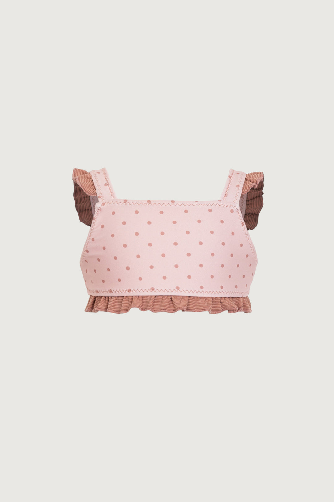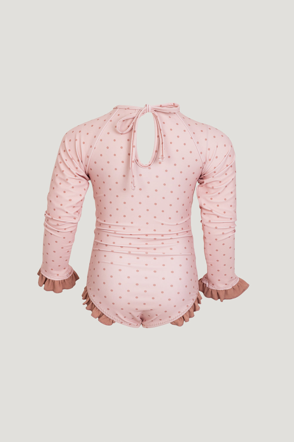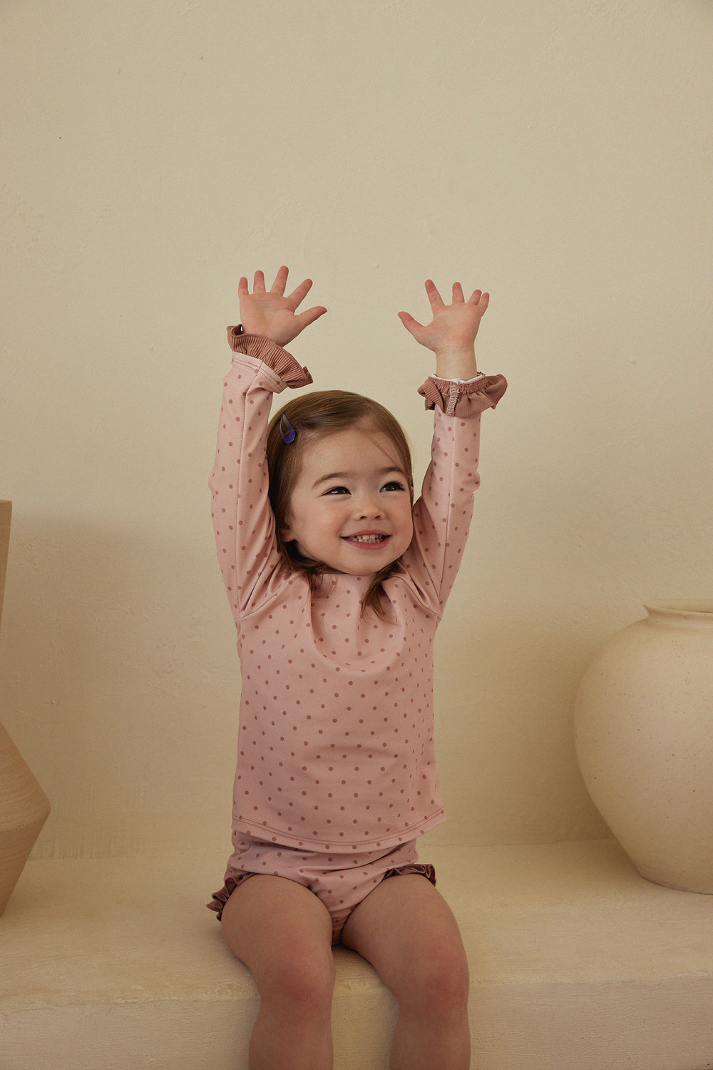 The ruffle rashguard is a closer fit for extra coverage while allowing for plenty of movement. ruffles are added to the sleeves for a girlie touch. rest assured knowing your mini is sun-safe.