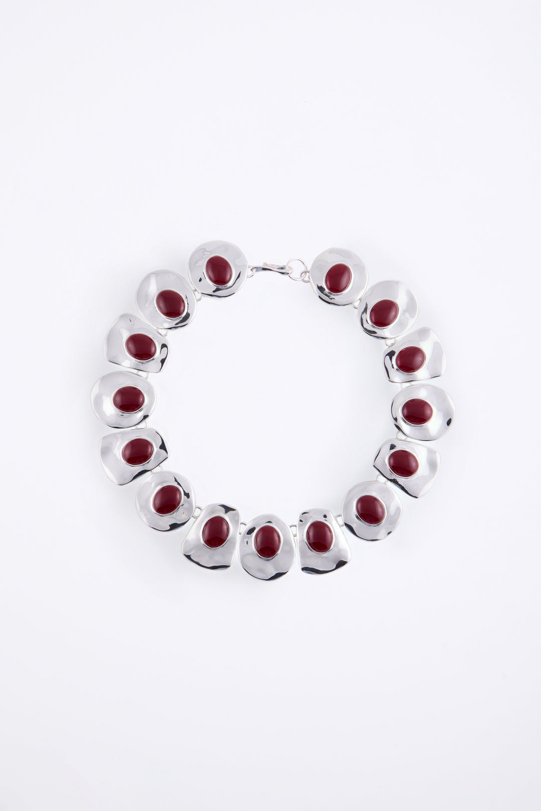 The Stone Drop Necklace features a polished silver collar anchored by a bold cabochon resin pendant framed in an organic, sculptural setting. A hammered silver square links the pendant to the collar, adding texture and dimension. Designed to sit at the collarbone.