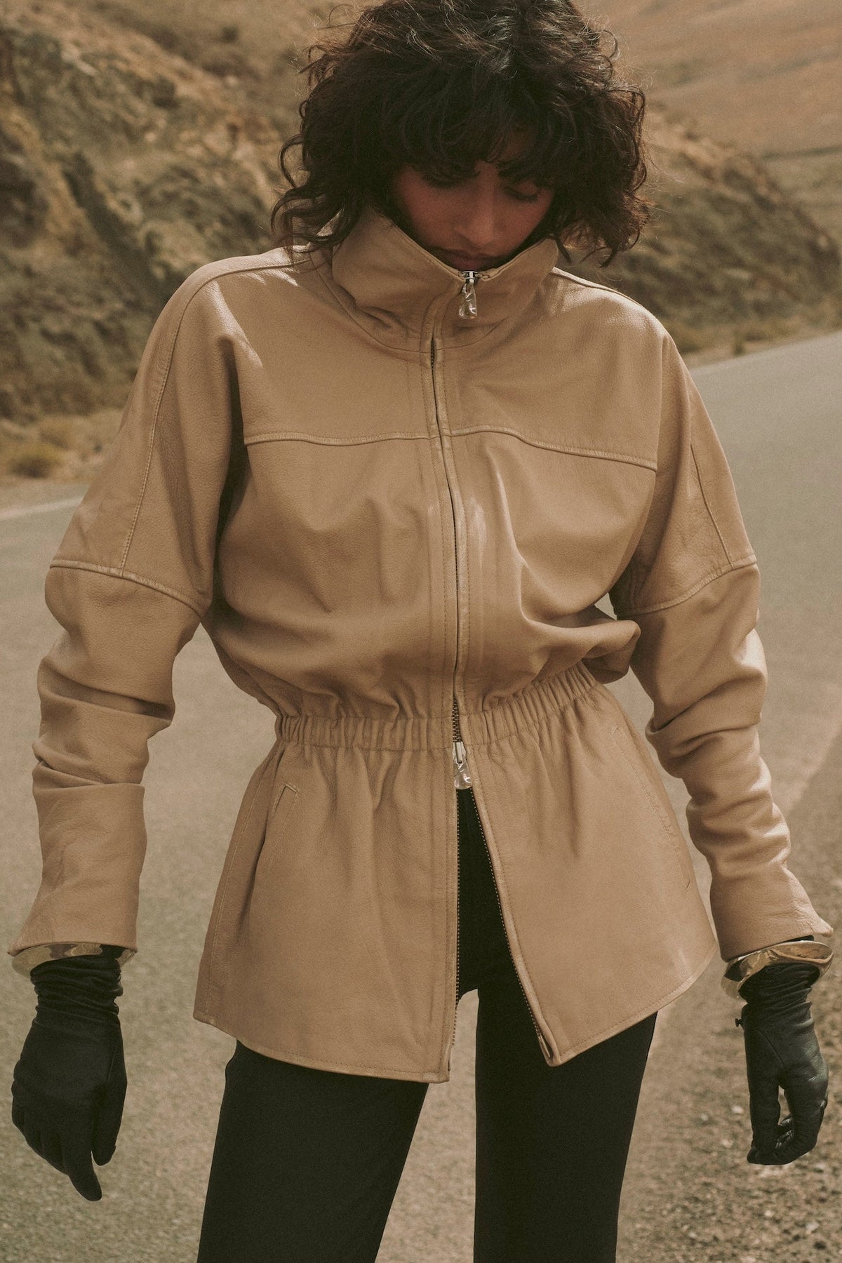 Crafted from 100% leather with a distressed finish, this parka has an he exaggerated collar that zips high for dramatic effect, while a double-ended zipper with custom hammered pulls adds polish. Designed with an elasticized natural waist for a flattering shape, the silhouette billows at the top before tapering cleanly through the body. Slightly heartier in weight, this piece is made to last.