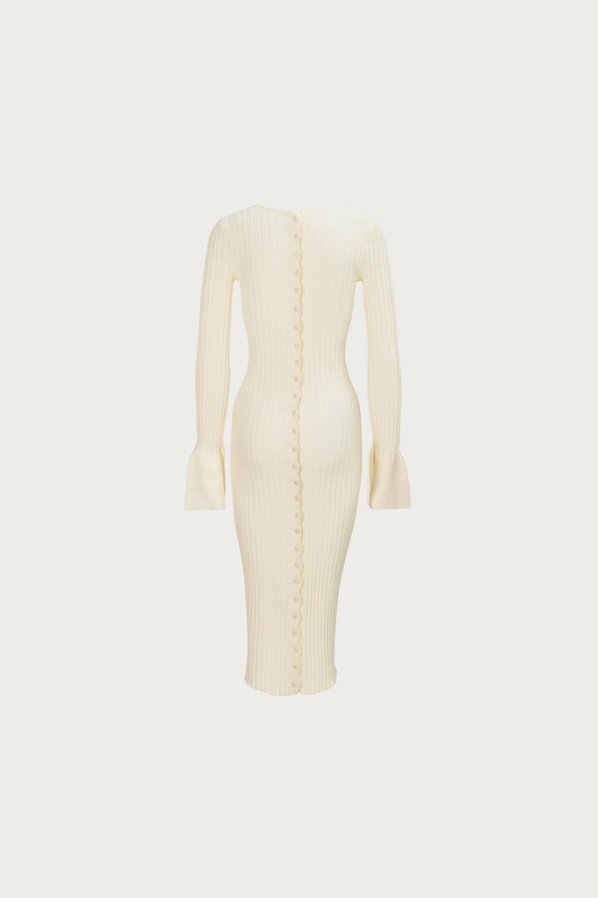 A modern essential reimagined, this ribbed knit dress features acrylic mother-of-pearl button detail along the back. The silhouette falls to a maxi length and finishes with dramatic bell cuffs for sculptural volume. Streamlined yet directional.
