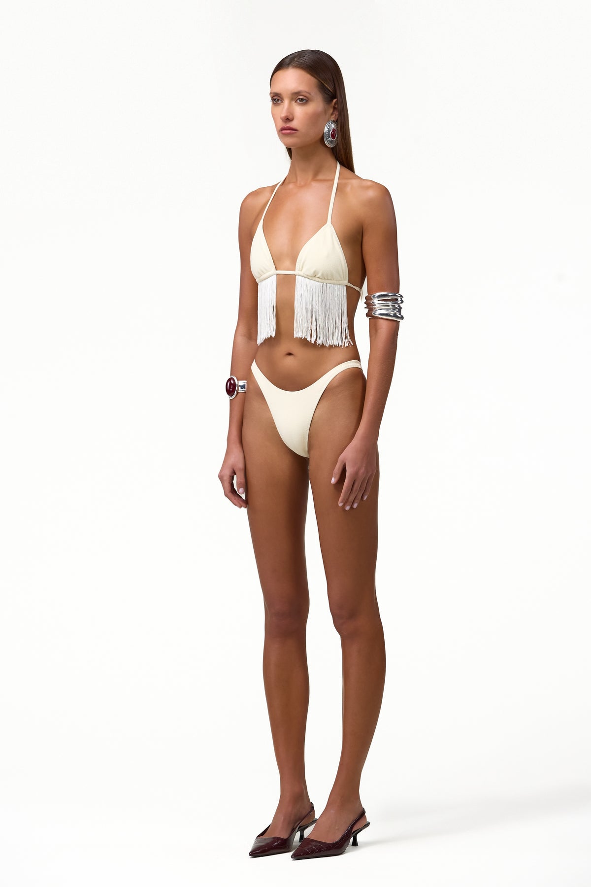 A minimal triangle bikini top finished with cascading fringe that falls to the mid-torso, creating fluid movement with every step. Designed with slim ties and a clean, sculpted fit, it balances a classic swim silhouette with a striking statement detail.
