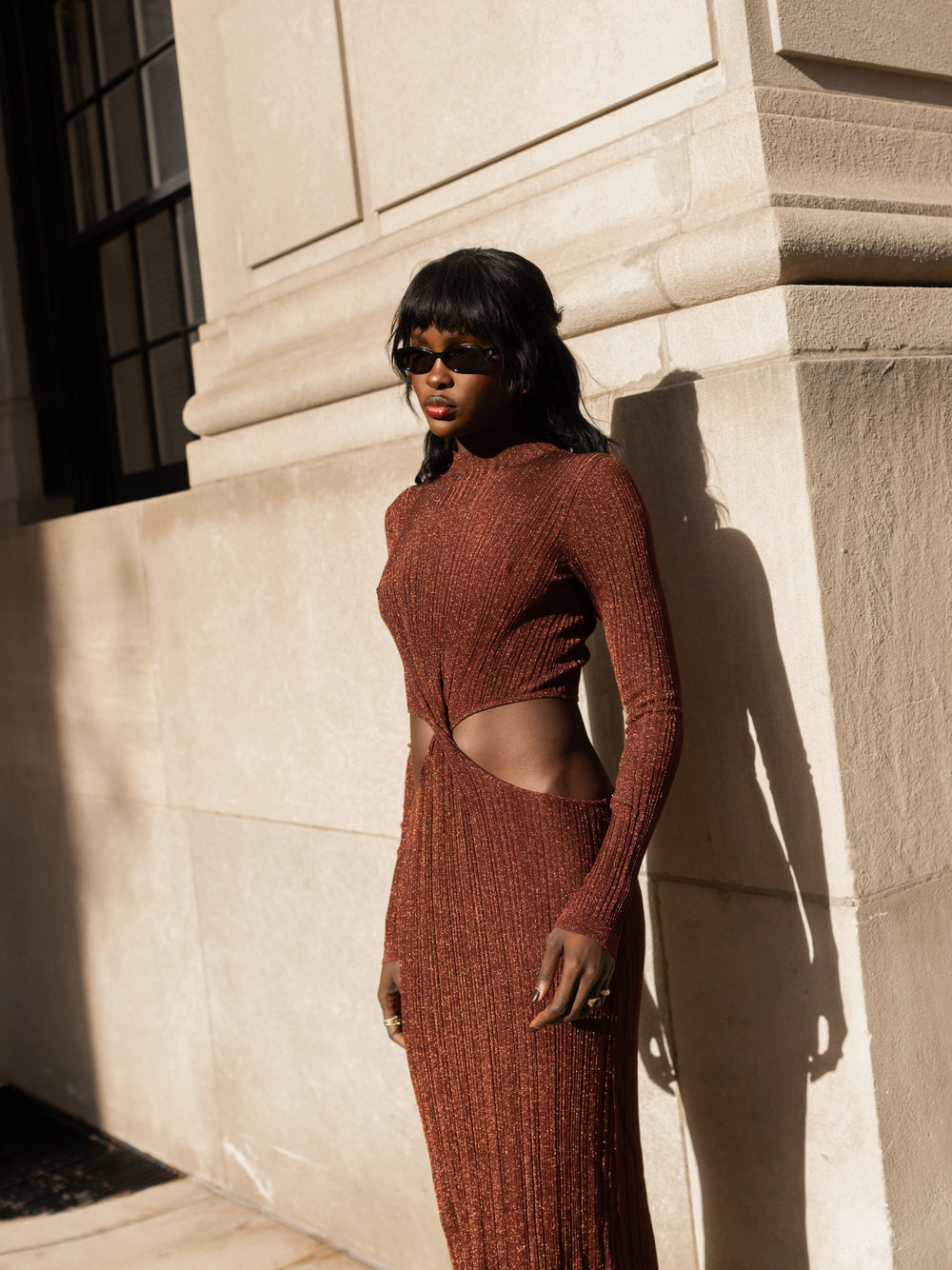 Crafted in a custom metallic rib knit, the Twist Maxi is designed to shimmer in movement and catch the light. The form-fitting silhouette features a mock neck, a functional twist at the natural waist, and an open back that contrasts the front. Stretch construction allows for ease of wear with no closures.
