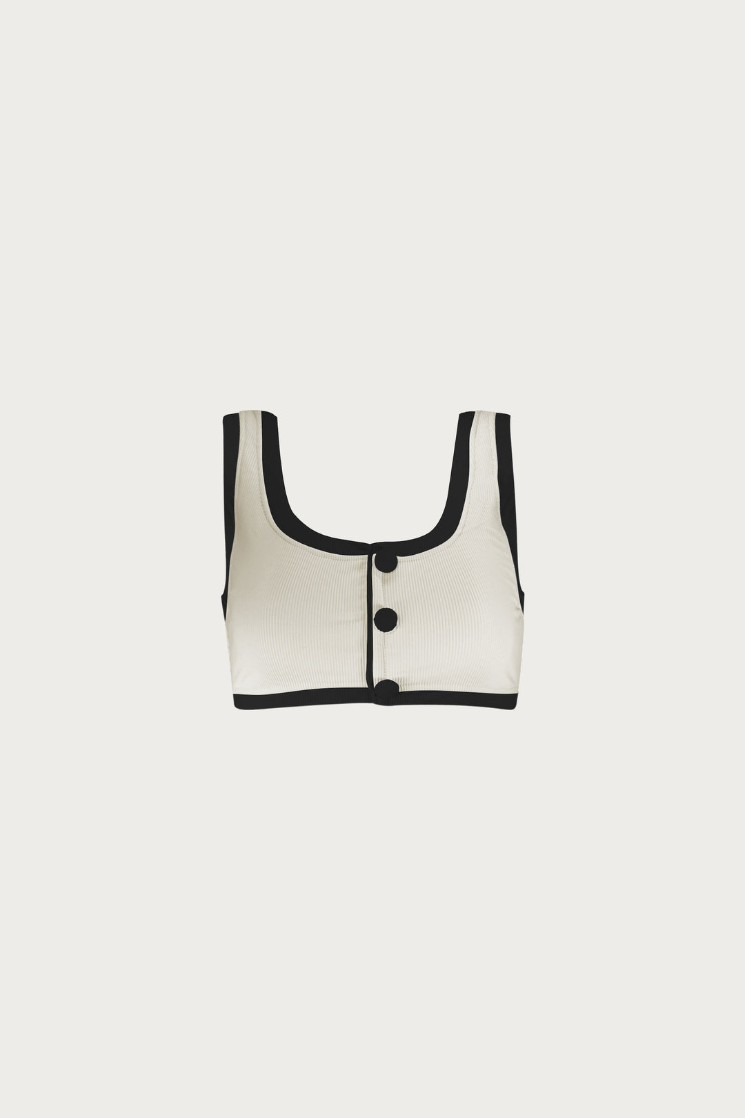 The Grace Bottom is a modern take on vintage swimwear with contrasting trim and a button front.