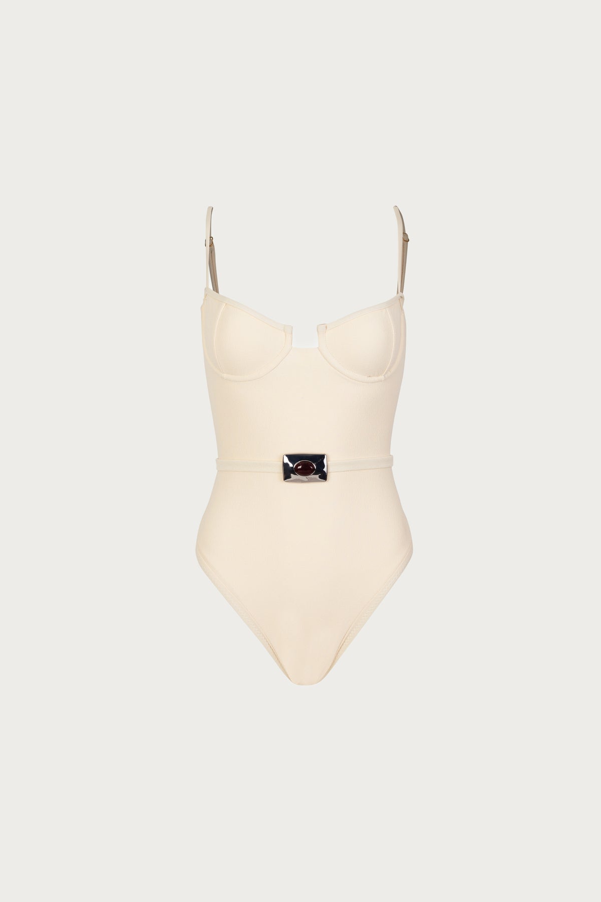 The Hammer Stone one piece includes underwire support and removable waist belt with custom silver hammered hardware detailing.
