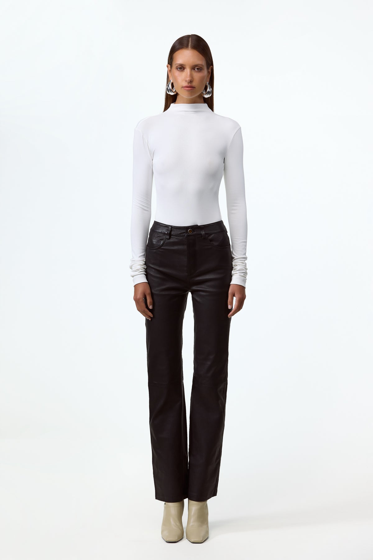 A sleek base layer with a second-skin fit, this nylon jersey bodysuit features a subtle rib for texture and natural stretch. Designed with a mock neckline, extra-long sleeves, and a snap-button closure, it offers full coverage in the back with a compression-like feel that holds its shape wear after wear.