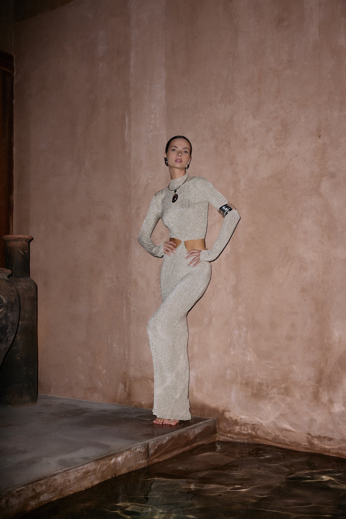 Crafted in a custom metallic rib knit, the Twist Maxi is designed to shimmer in movement and catch the light. The form-fitting silhouette features a mock neck, a functional twist at the natural waist, and an open back that contrasts the front. Stretch construction allows for ease of wear with no closures.