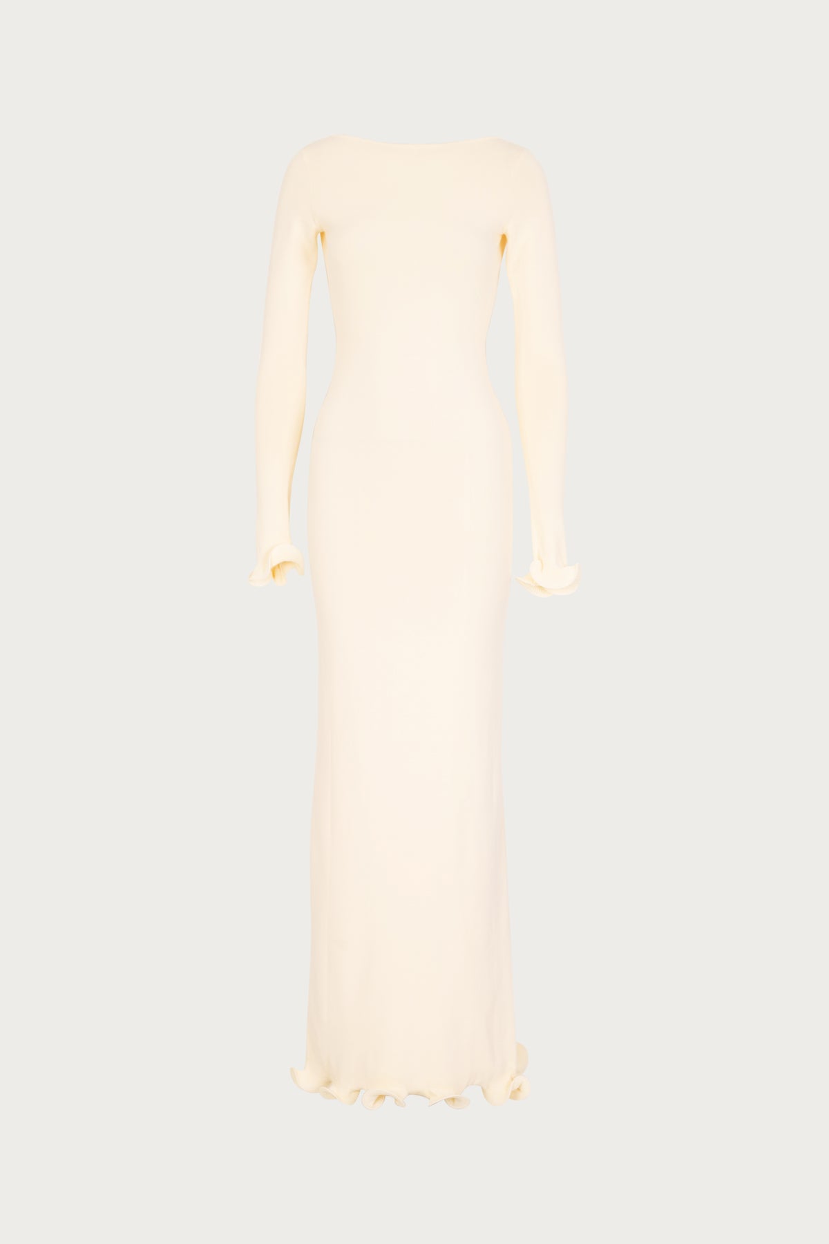 This long-sleeve floor length dress features a sleek, body-hugging silhouette with sculptural ruffle hemline and cuff details. Rendered in a finely knit fabric, it offers both structure and comfort. The boat neckline makes it the ideal versatile piece for elevated occasions.