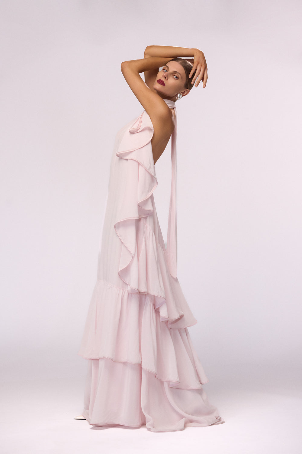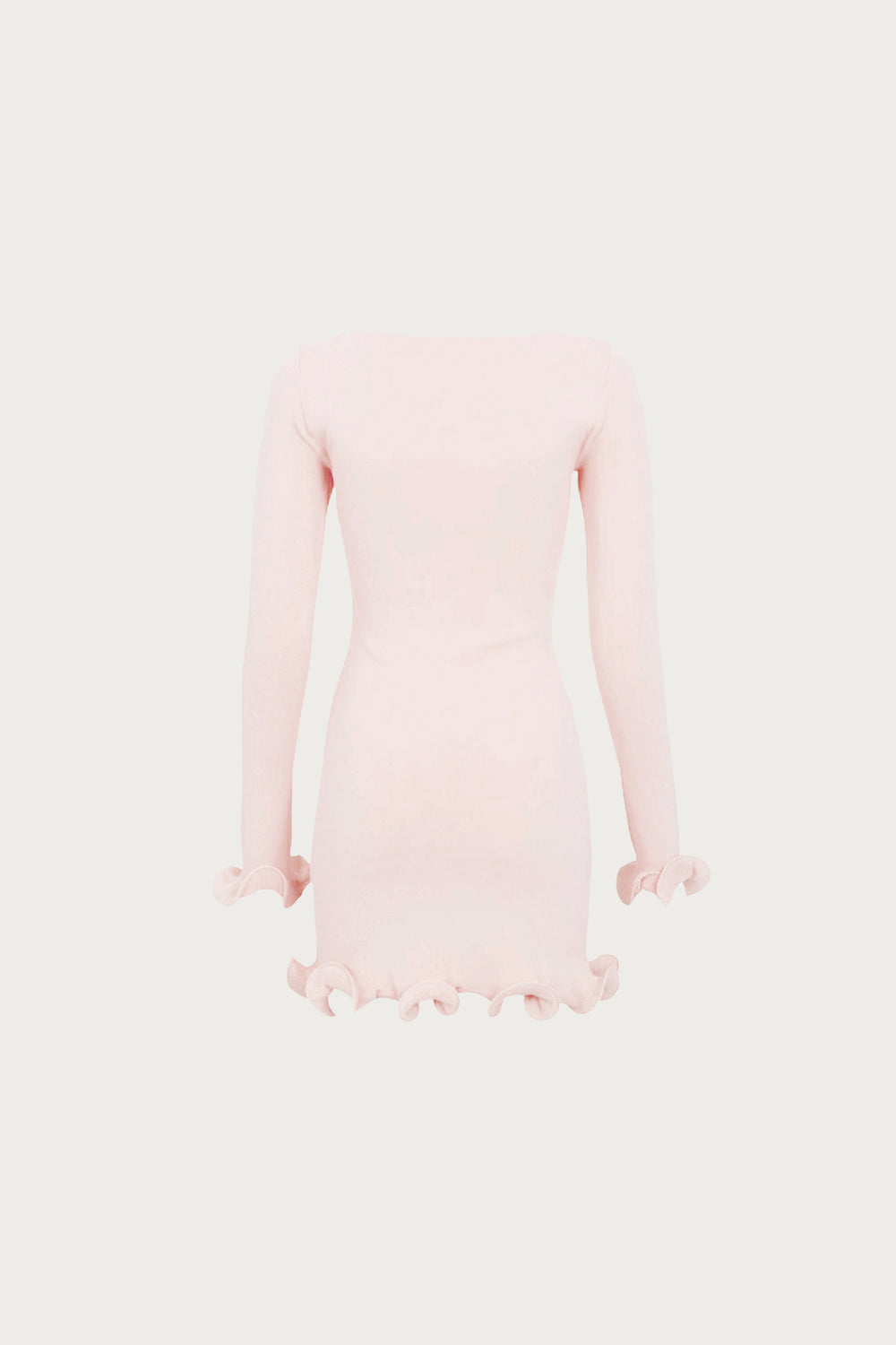 This long-sleeve mini dress features a sleek, body-hugging silhouette with sculptural ruffle hemline and cuff details. Rendered in a finely knit fabric, it offers both structure and comfort. The flattering boat neckline makes it the ideal versatile piece for any occasion.