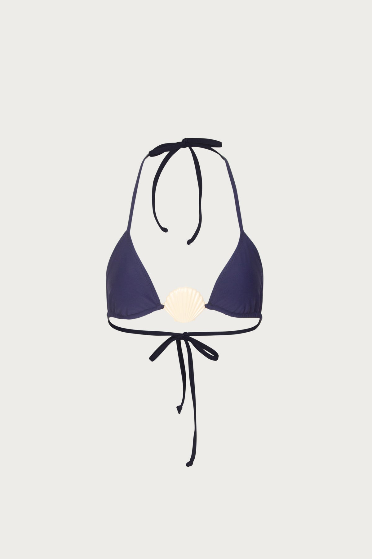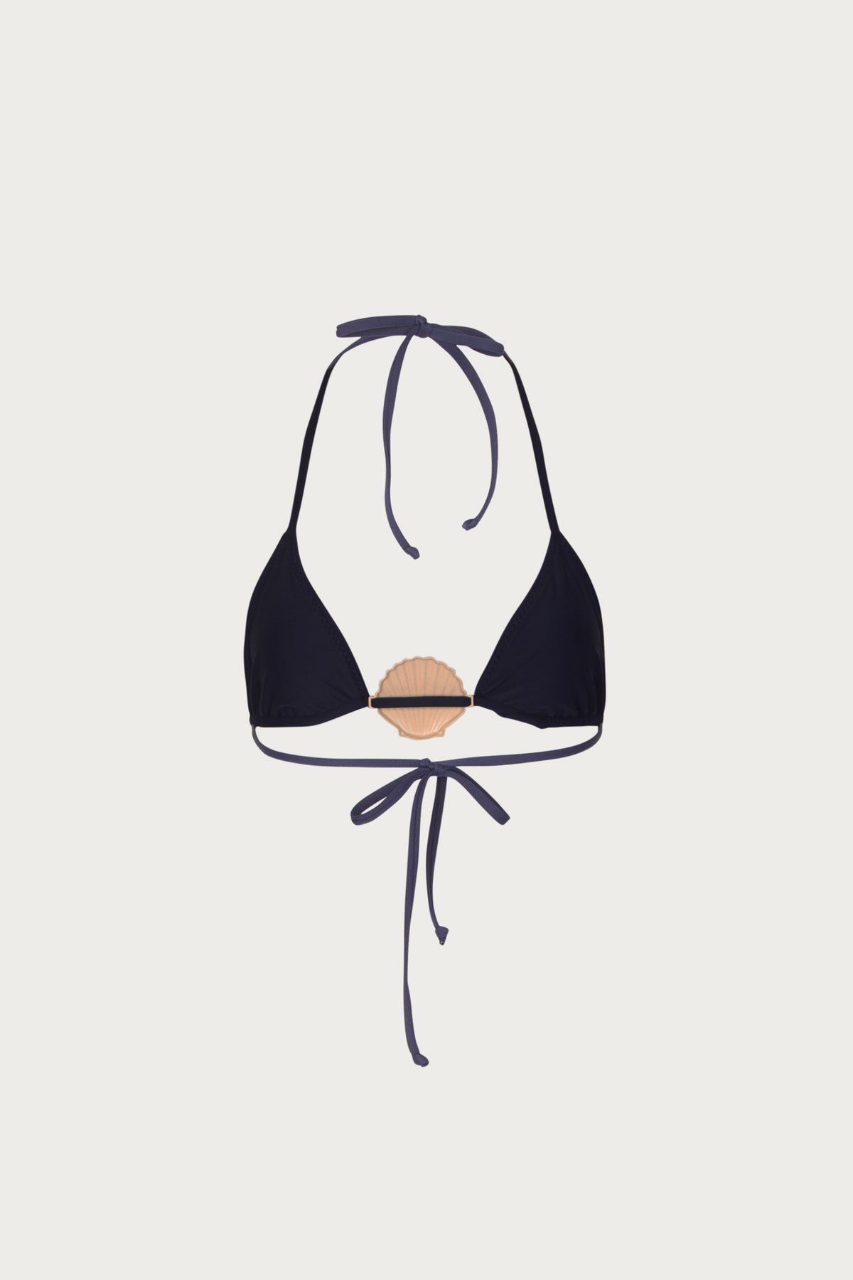 The Shell Triangle Top is our take on the classic triangle silhouette. A custom sculpted shell detail sits at center front. With adjustable ties at the neck and back, the fit is completely customizable.